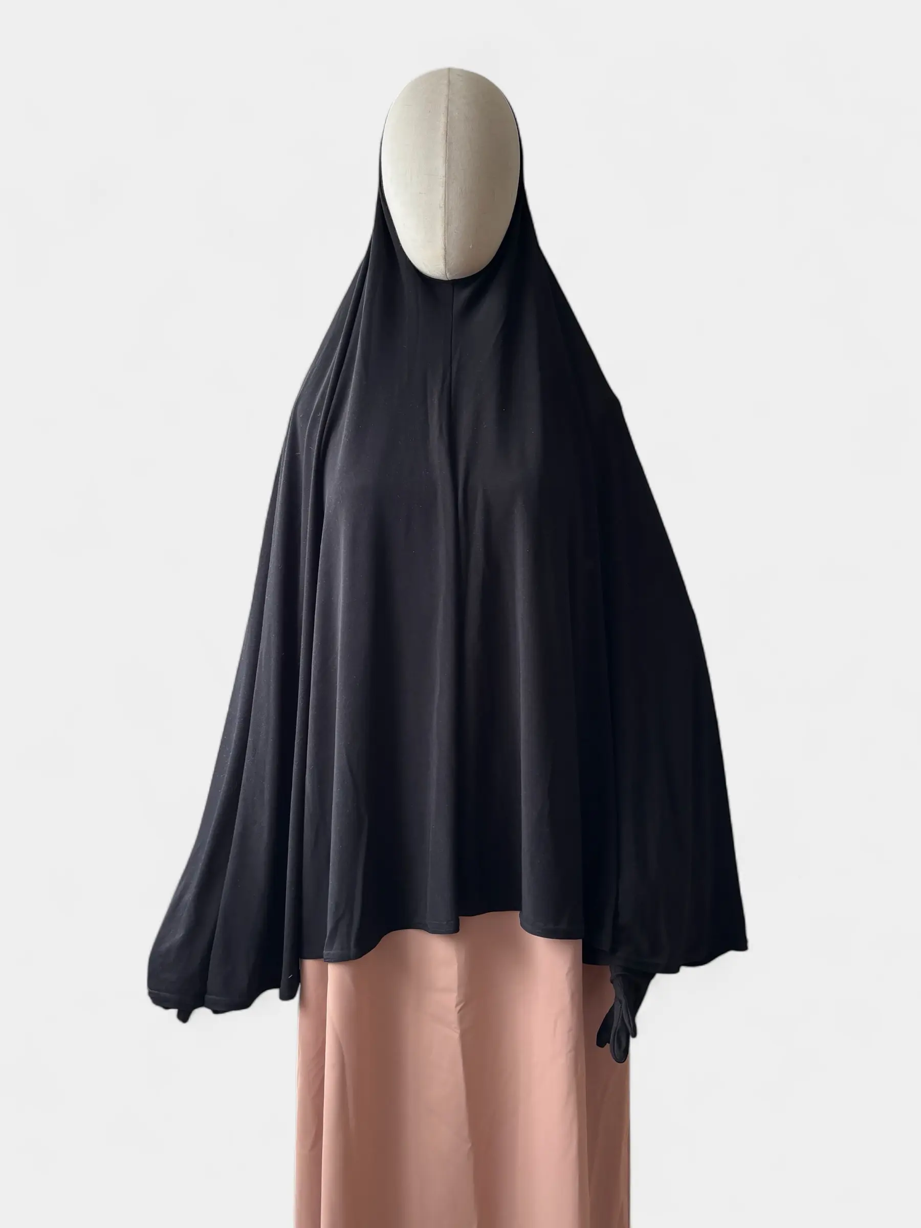 Craquez pour notre khimar jersey noir, conçu pour les femmes en quête de pudeur, de confort et d’élégance. Son tissu en jersey est à la fois doux, fluide et opaque, idéal pour une couvrance parfaite au quotidien ou lors d’occasions spéciales.